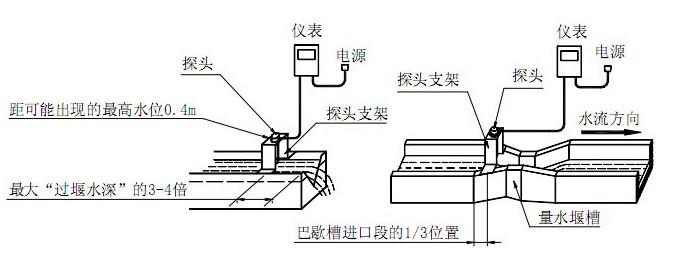 超聲波明渠流(liu)量計的探頭可(kě)以直接安裝在(zài)量水堰槽水位(wèi)觀🛀🏻測點的上方(fang)。探頭發聲的一(yi)面要對準水面(miàn)。可以用水平尺(chǐ)放在探頭上蓋(gài)上,通過校上蓋(gài)水平使✉️探頭對(duì)準水面。巴歇爾(er)槽水位觀測點(diǎn)在距喉道2/3收縮(suo)段長位置🥵(如下(xia)圖的La);三角堰、矩(jǔ)形堰在上遊一(yi)側,距堰闆3~4倍過(guò)堰水✔️深處。(如下(xià)圖)