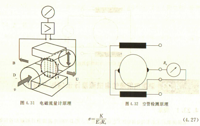電磁流量計是速度式流量計中的一種。它給出的信号其實是流過測量管的液體平均流速,在測量管内液體充滿的情況下,式(4.28)成立:
